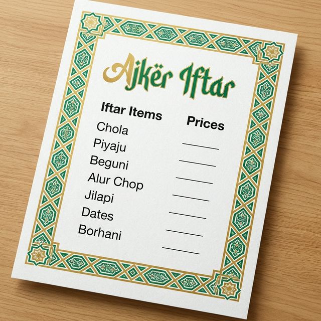 | ** মিনি ইফতার** | পেঁয়াজু ৩ + বেগুনি ২ + ছোলা ১ বাটি + শরবত ১ | ৬৫ টাকা | ৬০ টাকা | ৫ টাকা |